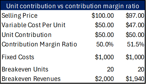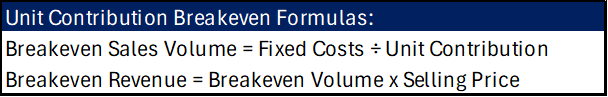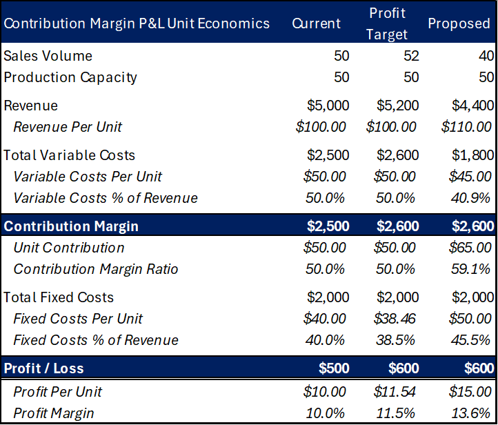How can you rearrange your financial data to provide the key insights needed to determine which areas to improve, opportunities to create competitive advantages, and increase overall future performance? Unlocking the Power of Cost-Volume-Profit AnalysisIf you've consumed our last content piece covering unit economics, you know how we can gain far better insights into the profitability of a single unit for as an average across the company, a specific product or customer, or other segmentations. To recap, this is achieved by grouping costs based on how the behave (variable versus fixed costs) instead of how they are normally classified (Cost of Goods Sold vs Selling, General & Administrative costs). We then divide the relevant revenues and cost behavior groupings by the segment's sales volume to arrive at per unit metrics such as revenue per unit, unit contribution, and profit per unit. Unit contribution is revenues minus variable costs divided by the sales volume. Each additional unit sold can be used to cover fixed costs and the surplus falls to the bottom line as profits. Unit economics was a key step to formatting financial data in a far more useful view for those working in the business. Now we'll build on those principles by adding Cost-Volume-Profit (CVP) Analysis. CVP analysis uses the contribution margin P&L format (Revenues minus variable costs = contribution margin. Contribution margin minus fixed costs = profit/loss). This makes it far easier to see how changes to pricing, costs, and sales volume affects total profits. You will be able to determine which products, customers, and other segments are most profitable and which ones need adjustments in order to improve future performance. CVP analysis enables you to perform breakeven and profit point analysis. Breakeven means determining the sales volume required to cover fixed costs and not lose any money. Profit point gives you the sales volume required to hit a desired level of profits as measured in dollars or profit margin as measured in percentage of revenue. You can calculate breakeven volume and revenues using unit contribution (Revenue minus variable costs = Contribution Margin. Contribution Margin ÷ Sales Volume = Unit Contribution): Alternatively, you can use the contribution margin ratio (Contribution Margin ÷ Revenue): An example is $100 selling price, $50 unit contribution, and $1,000 fixed costs: Alternatively, we could use contribution margin ratio ($50 unit contribution ÷ $100 selling price = 50%): We can tweak these formulas to determine the sales volume and revenues required to return a desired level of profit: Here's an example using $1,000 fixed costs, $500 profit target, $50 unit contribution, and $100 selling price: If we want to target a desired profit margin, we would use a different variation: Here's an example using $50 unit contribution, 10% profit margin target, $100 selling price, and $1,000 fixed costs: Putting Breakeven and Profit Point Analysis Into PracticeBreakeven and profit point analysis can highlight how breakeven sales volume and revenues or profit point sales volume and revenues change when you implement changes to selling price, variable costs per unit, and fixed costs. For example, when unit contribution increases, the sales volume required to breakeven or hit a profit target decreases (and vice versa). This can be accomplished through a reduction in variable costs per unit or an increase in selling price. When the contribution margin ratio increases, breakeven and profit point revenues decrease (and vice versa). Contribution margin ratio increases when the unit contribution as a percentage of selling price increases. There are instances where unit contribution can remain unchanged, but contribution margin ratio increases or decreases. Example: Here we see we decreased our selling price by $3 and reduced our variable costs per unit by $3 as well. This leaves unit contribution unchanged at $50, but contribution margin ratio increases from 50.0% to 51.5%. This leaves breakeven units unchanged, but decreases breakeven revenues from $2,000 to $1,940. Knowing this can point to specific strategic decisions to improve performance. When you are approaching or at maximum production capacity, implementing a price increase can reduce sales volume, but the increased selling price may return a higher level of total profits. Here's an example: Our profit target of $600 at $50 unit contribution and $2,000 fixed cost requires a sales volume of 60, which is 10 more than our 50 unit production capacity. After evaluating our product and customer portfolio, we may implement a higher selling price for a specific customer due to its low profitability and the customer gives us headaches. The customer opts to do business with someone else, but this actually ends up increasing our profits as the selling price was below average and the variable costs to fulfill that customer was higher than our overall customer base's average. Instead of operating at 100% capacity, we operate at 80% capacity (40 sales volume vs 50 production capacity). Despite this decrease in sales volume, we are able to hit our $600 profit target as our revenue per unit increased 10% from $100 to $110 and our variable costs decreased 10% from $50 to $45 per unit. This increased both our unit contribution and contribution margin ratio, which means we can hit our profit target at a lower revenue and sales volume. Implementing Breakeven and Profit Point AnalysisBreakeven and profit point analysis are important tools enabled by the use of the Cost-Volume-Profit Analysis. Ensure you format your P&L data based on the contribution margin P&L (which groups costs by how they behave) instead of standard P&L formats. This ensures when volumes change, revenues and variable costs also change while fixed costs remain the same. This analysis allows you to see just how much sales volume and revenues are required to breakeven or hit a desired level of profit fo