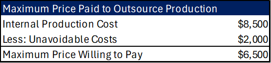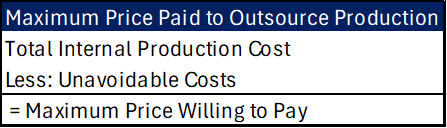 Each of these requires identifying what information is and is not relevant to the decision at hand, as well as capturing the incremental benefit or cost associated with the given decision. Make-or-Buy Decisions: Calculating Your Maximum Outsourcing PriceThis type of decision is to determine whether we are better off producing something in-house or if we should instead outsource it. We need to identify all relevant costs, both variable and avoidable fixed costs, as well as any opportunity costs. Opportunity costs are the forgone benefit by pursuing one option over another. We want to know the most amount we would be willing to pay to have a given product or function outsourced. To accomplish this, we would use the following formula: Let's use this in an example with the following information: