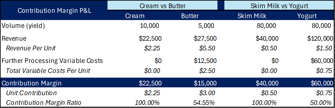 Here's our current production for product A's financials for operating at capacity: We would have to decrease our Product A's production volume by 200 to accept the special order. This represents $10,000 contribution margin ($50 unit contribution multiplied by 200 units). Since our special order variable cost estimate is $70 per unit, we would require a minimum selling price of $120 per unit in order to offset the decrease in contribution margin from producing less of Product A ($70 variable cost per unit estimate + $50 unit contribution = $120 selling price). But as we've noted, variable costs could potentially skew upwards towards the $77 per unit range, putting our target selling price closer to $127 per unit. On top of this, it doesn't make sense for us to accept the order if our profits were the same as what our current operations produces. We would want to see total contribution margin increase as a result of accepting the order. A selling price of $140 or more may be what we require to make it worth our time. If the market price was closer to $100 per unit, we would not be able to win a bid for this order as anything lower than $140 would not increase profits above current levels. Our production capacity level has dramatic effects on the selling price we would require to produce the same customer order. There are also qualitative factors to consider. Existing customers can become upset if you delay their orders in favor of fulfilling a special order. An existing customer may be providing negative contribution margin, which a special order gives you the flexibility to implement a price increase to see if you can either turn that customer profitable with a higher selling price, or profits can be improved by having that customer leave and backfilling their production with the special order. More often than not, there is no benefit from producing a special one-time order when operating at capacity unless you have existing customers with negative contribution margin. You'll only risk pissing off your existing customers, which creates downward pressure on long term profits. Sell or Process Further: Maximizing ProfitSell or further processing decisions require analyzing whether it is more profitable to sell products as is, or to incur additional costs to further process them into products with higher contribution margin levels. As an example, a dairy plant processes whole milk into cream and skim milk. At this point, they can choose to sell the cream and skim milk, or further process them into butter (further processing cream) and/or yogurt (further processing skim milk). To determine what is most profitable, we have to isolate the relevant costs and revenues with this decision. Processing whole milk into more than one product using the same production process is called joint production processing. Joint production costs are the costs incurred during this process and the costs cannot be isolated to one product over the other. Eventually, a split off point occurs where the individual costs to process each product can be measured. All costs up to this point are joint costs that are shared between all products. Costs after this point are assigned to the individual products. For our analysis, joint costs are irrelevant. This would be the costs incurred to turn the whole milk into cream and skim milk. They cannot be changed no matter what our decision ultimately is. What is relevant to our analysis is the additional costs we would incur by further processing the cream into butter and the skim milk into yogurt. We can choose not to incur these costs if we choose to sell the cream and/or skim milk without further processing. The next step is to compare the contribution margin of the cream and/or skim milk versus the contribution margin of the butter and/or yogurt, assuming we have no difference in fixed costs. Here's how it looks: We can see the further processing of cream into butter produces a lower contribution margin than just selling the cream as is. But for skim milk, the further processing into yogurt produces a higher contribution margin. It would be most profitable to sell the cream as is and further process all skim milk into yogurt. This assumes we can sell the entire production run for the given mix. We may not be able to do so. It can be more profitable to further process some portion of the cream into butter, even though it has a lower contribution margin. Failing to do so may leave us with unsold cream that results in spoilage and lost revenue, which can lead to a lower level of contribution margin compared to selling some combination of cream and butter. The same goes for yogurt. We may be better off processing only a portion of the skim milk to ensure we are able to sell everything we produce to minimize spoilage and maximize profits. Marginal analysis helps manufacturers determine whether the incremental benefit outweighs the incremental costs when faced with a variety of decisions. Our next series will be taking a look at pricing strategies to help manufacturers increase their profits by understanding potential impacts to sales volumes with pricing changes. Work With UsYou can watch videos and read newsletters all day, but nothing beats looking at your own numbers. If you're ready to stop guessing and start implementing a clear financial strategy that puts more profit in your pocket, then it's time for my 1:1 Financial Clarity Assessment. We'll deep-dive into your company's financials to pinpoint the exact levers you need to pull for immediate, actionable improvements. Click the link here to book your assessment today. Clarity drives profit and cash flow. |